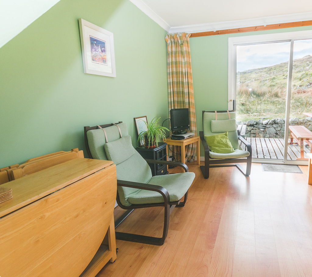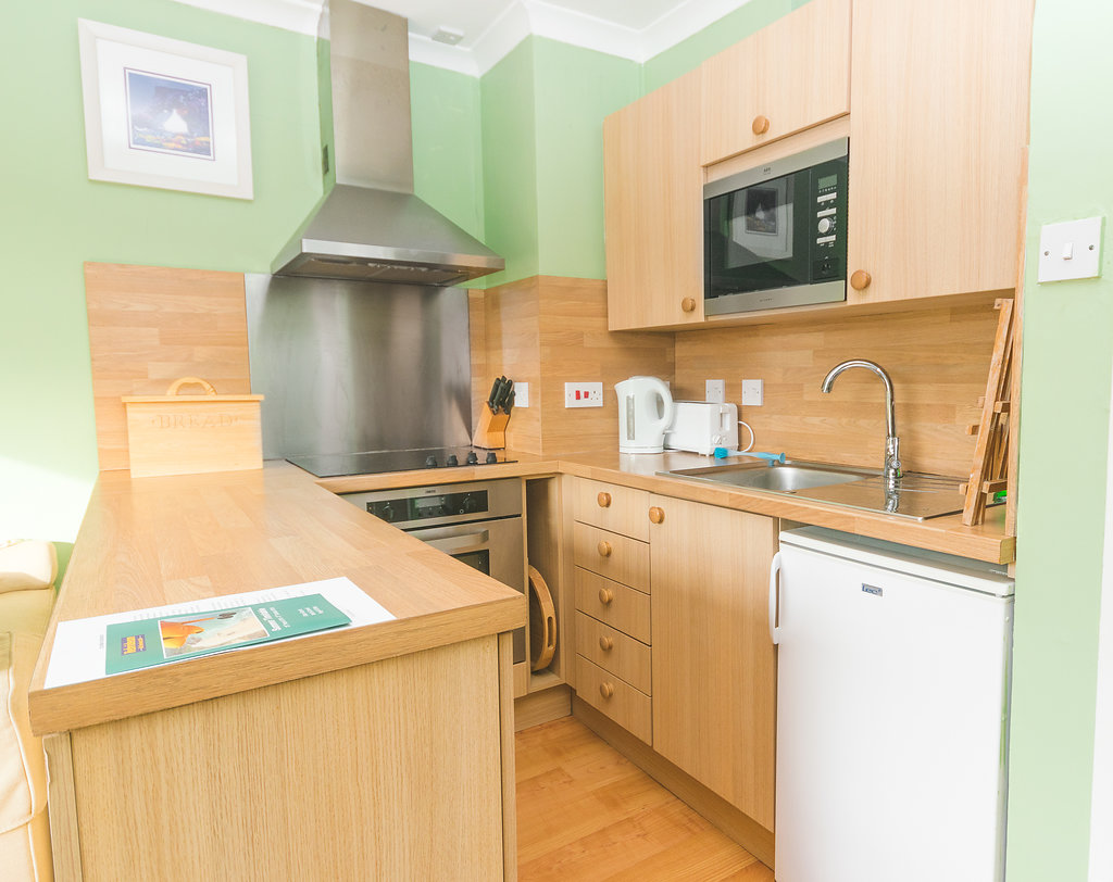 Maghnus Lodge has a comfortable lounge downstairs with open-plan kitchen area which is well equipped with ceramic cooker and oven, fridge, microwave, kettle, extractor hood etc.